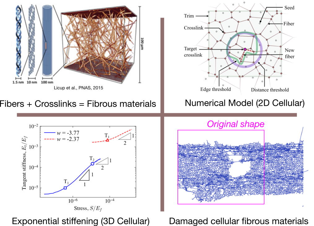 Constitutive modeling of fibrous materials using neural network: Soft fibrous materials exhibit novel non-linearities due to their microstructural features. Conventional hyperelastic models are often inadequate as constitutive models for these materials. This project introduced a neural network-based surrogate computational model that accurately predicts the mechanical response of such materials. Read more at: https://doi.org/10.1007/s00366-024-02095-8